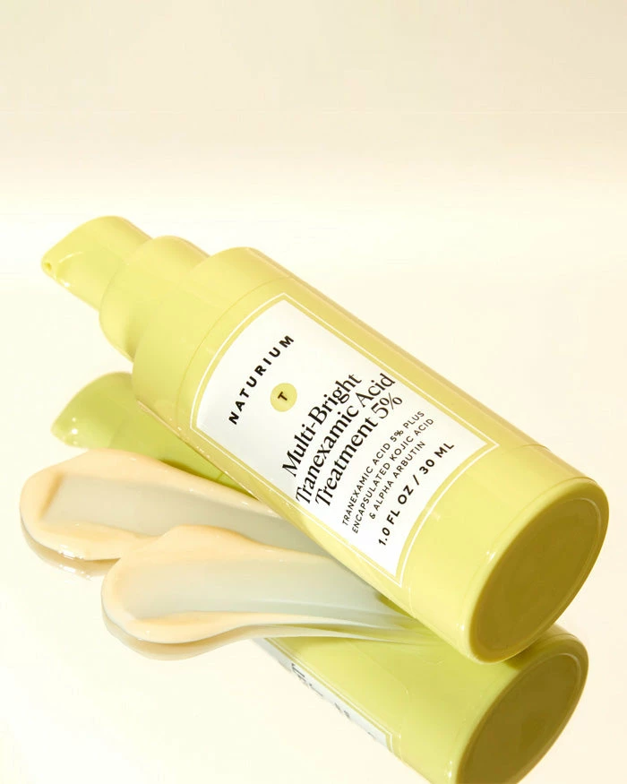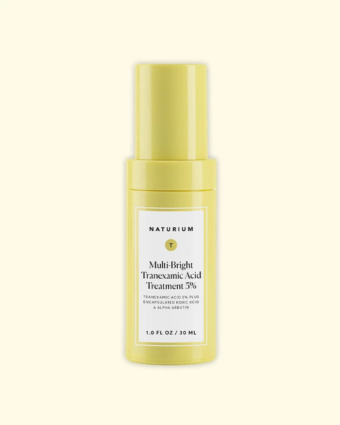 Brighten your complexion with Naturium Multi-Bright Tranexamic Acid 5%. A topical serum that blends tranexamic acid, encapsulated kojic acid, alpha arbutin and acetyl glucosamine to target brightness and combat uneven tone and texture. It’s ideal for all skin types and tones and especially effective for sensitive, problematic skin.
