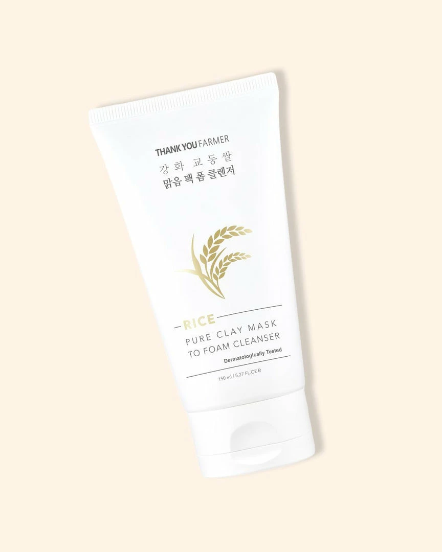 Detoxify and cleanse skin with this transformative 2-in-1 multi-tasking Thank You Farmer Rice Pure Clay Mask to Foam Cleanser. This smooth, almost mousse-like formula first spreads on first as a clay mask, purifying pores with kaolin and bentonite clays. Then, add warm water and the cleanser foams up to gently cleanse and exfoliate with rice, oat, quinoa and cereal extracts. Antioxidant-rich fig extract provides hydration and nourishment, while centella asiatica calms and soothes any redness. Pores will be more refined, excess sebum will be rinsed away and skin will appear smoother and more supple.