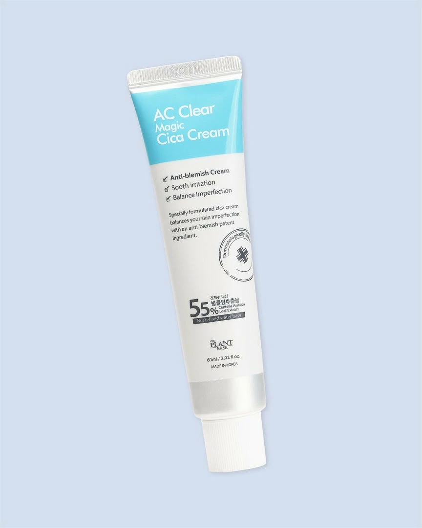 Repair inflamed, acne-prone skin effectively and gently with the AC Clear Magic Cica Cream from The Plant Base. Patented ingredient Inflaxβ’ provides relief to irritated acne-affected skin and works as a powerful antioxidant, while Natural Protectorβ’ provides soothing and revitalizing effects thanks to its acne-fighting properties. 55% centella asiatica (cica) extract and green tea powder calm inflammation upon application, while murumuru seed butter deeply moisturizes skin, helping to soothe even the most sensitive or irritated skin barrier. A favorite from our sampling program, this curation was a community request and heard many great testimonials after 30 days of consistent use.Β